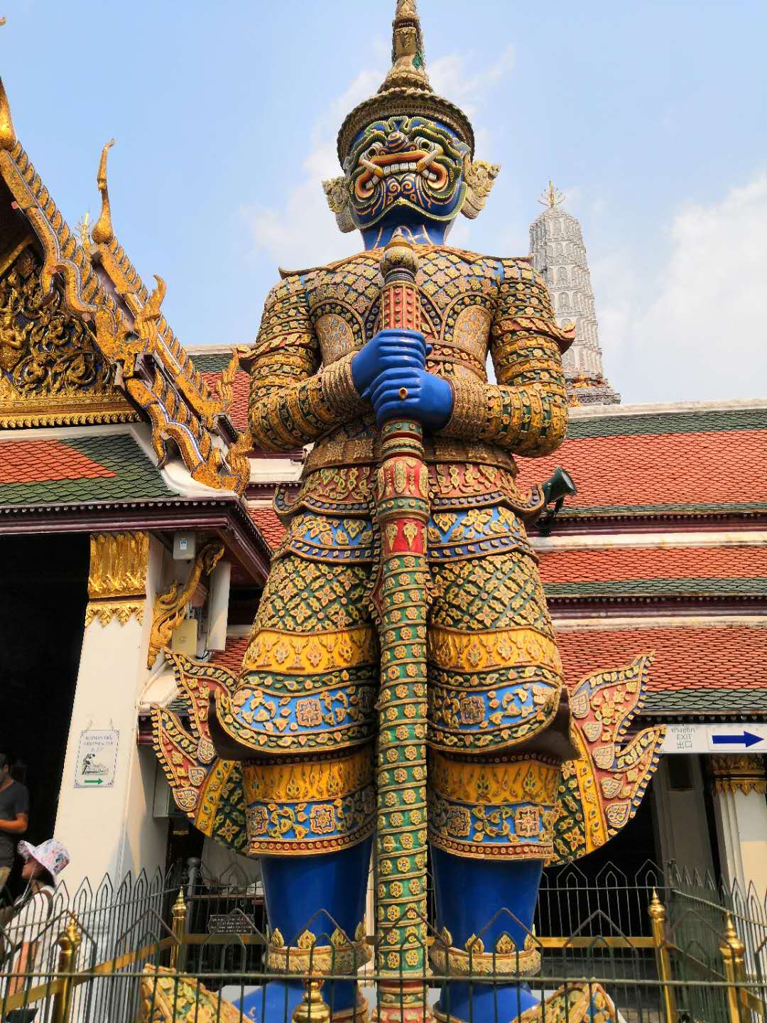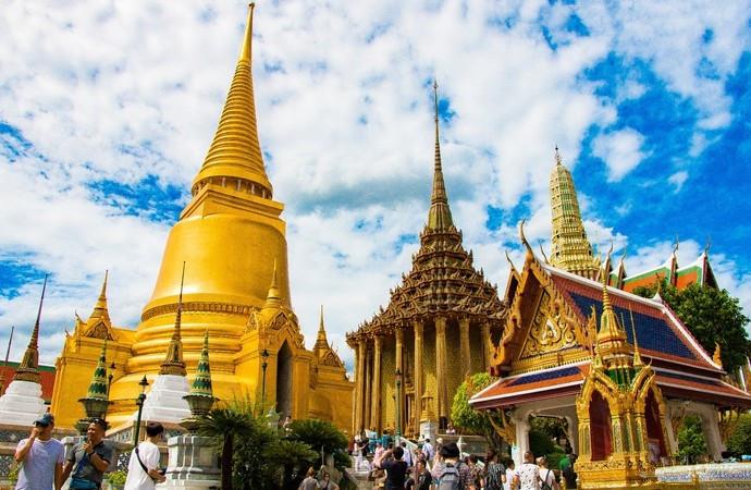 舉世聞名的大皇宮緊鄰著湄南河,是曼谷市中心內(nèi)一處大規(guī)模的古建筑群。走進大皇宮庭院,首先映入眼簾的是如茵的大片草地和姿態(tài)各異的古樹,草坪周圍栽有一些菩提樹和其它熱帶樹木。大皇宮的佛塔式的尖頂直插云宵,魚鱗狀的玻璃瓦在陽光照射下,燦爛輝煌。尖角高聳的廟宇、佛塔,在陽光的照耀下,玲瓏剔透、金玉璀璨,雕功細膩、精致美觀的高大金漆佛像、石雕和繪有泰國傳統(tǒng)圖案的壁畫,記載著與王國和佛教有關(guān)的故事。