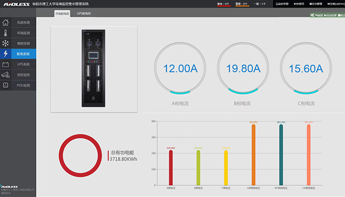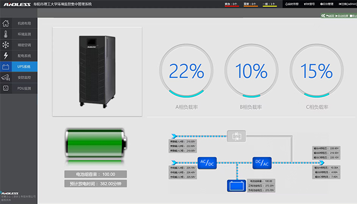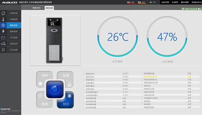 本次為阜陽理工學院提供配置的設備是安德力士品牌UPS不間斷電源主機、穩壓器、及動力環境監控系統一套,本次主要針對機房精密空調、漏水、煙感進行監控管理。