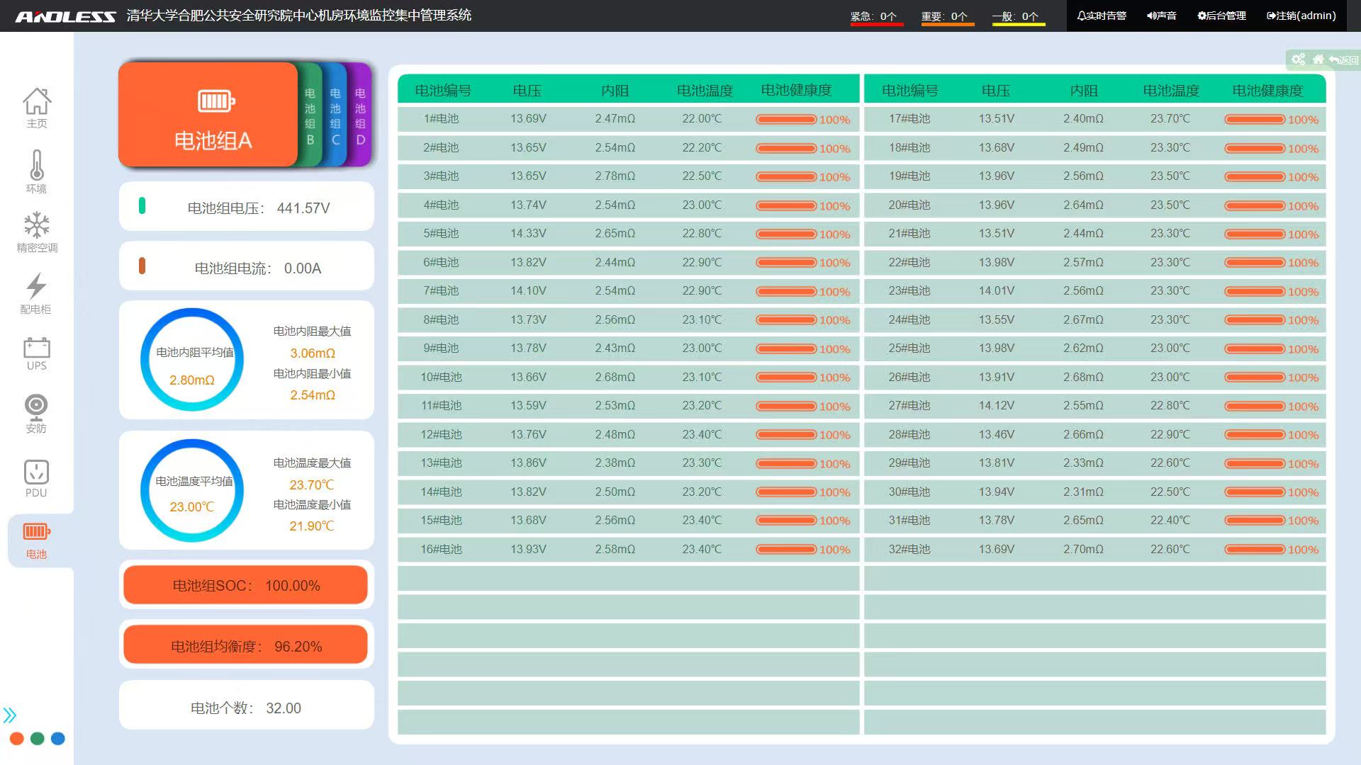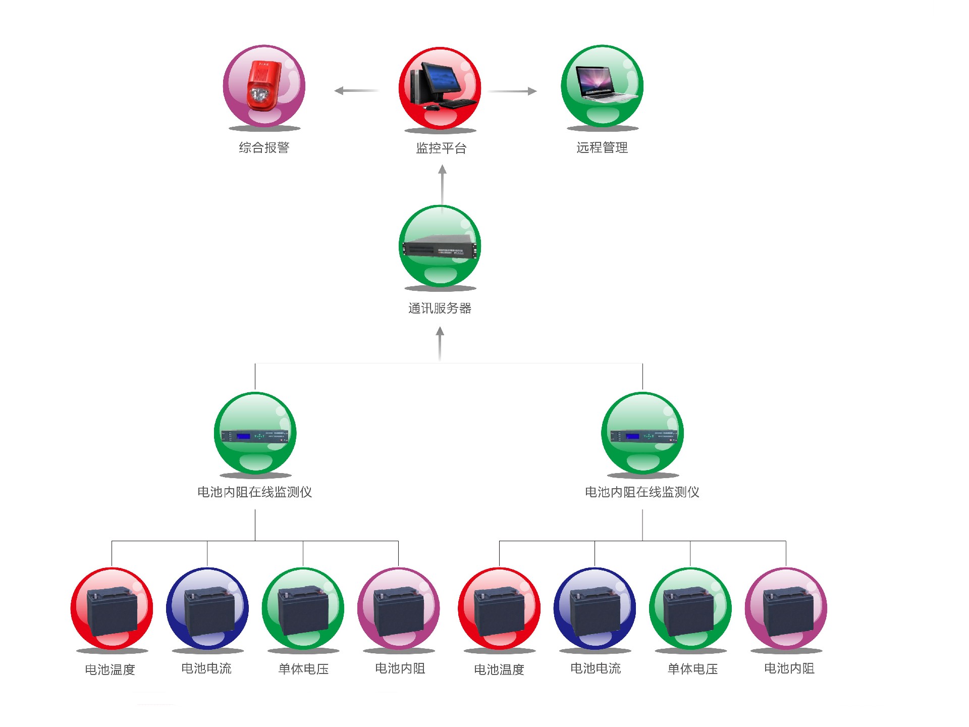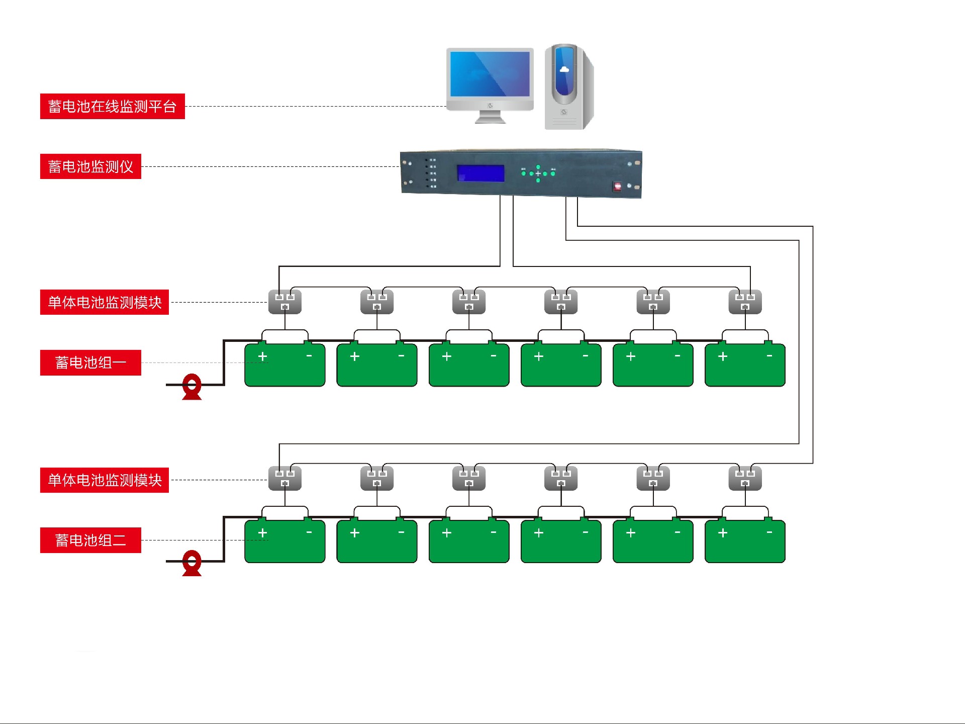 蓄電池是UPS系統(tǒng)的核心組成部分,它能夠在電力故障或斷電時提供臨時的電力支持,保證數(shù)據(jù)中心的正常運行。通過連續(xù)監(jiān)控電池狀態(tài),包括電壓、電流、溫度和內阻等參數(shù),UPS能夠及時發(fā)現(xiàn)電池健康狀況的變化,預測潛在故障,并在必要時提前更換或維護,從而避免突發(fā)性故障導致的服務中斷。這種監(jiān)測有助于延長電池壽命,降低維護成本,同時保證了電力供應的穩(wěn)定性。蓄電池網(wǎng)絡在線監(jiān)測系統(tǒng)是我公司利用最新的單體蓄電池參數(shù)傳感器技術,針對軍隊、通訊、電力、金融等領域蓄電池的使用現(xiàn)狀,開發(fā)的一套全新蓄電池網(wǎng)絡在線管理和監(jiān)測系統(tǒng)。該系統(tǒng)完美的結合了最新的在線蓄電池內陰測量技術和計算機網(wǎng)絡實時通訊技術,成功的解決了蓄電池的遠程監(jiān)控和狀態(tài)檢修的問題,使得蓄電池的日常維護工作均在網(wǎng)絡監(jiān)控終端完成。